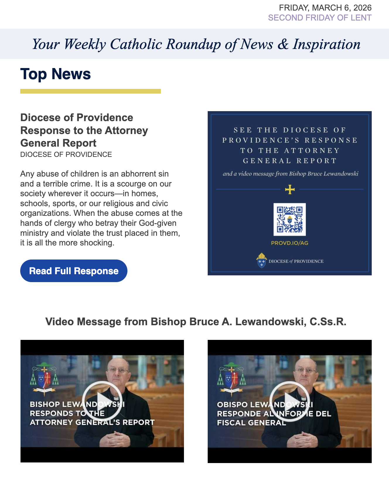 Diocese Responds to Attorney General Report / Sign up For Your Weekly Catholic Roundup Sign up here for your Weekly Catholic Roundup of News & Inspiration Diocese Responds to Attorney General Report Sign up here for your Weekly Catholic Roundup of News & Inspiration St. Peter's AdminMarch 5, 2026 Facebook0 0 Likes